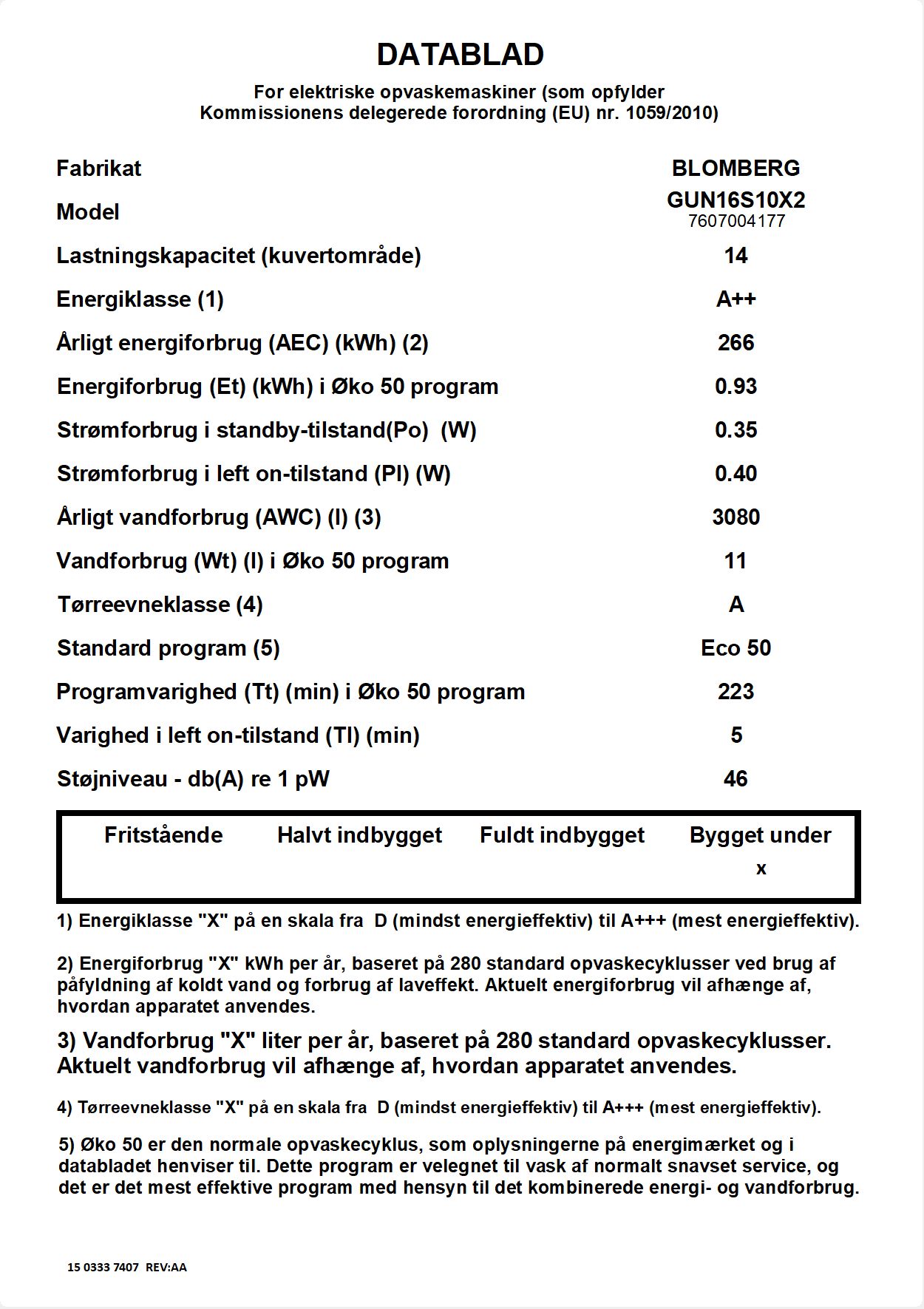 GUN16S10X2: Opvaskemaskine (14 kuverter, Full Size)