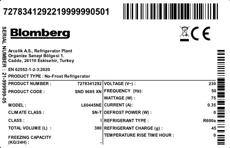 SND 9685 XN: Køleskab (Single Door - no freezer, 375 L)
