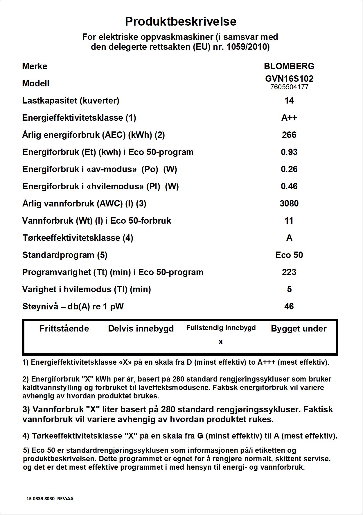 GVN16S102: Opvaskmaskin (14 plassinnstillinger, Standard størrelse)