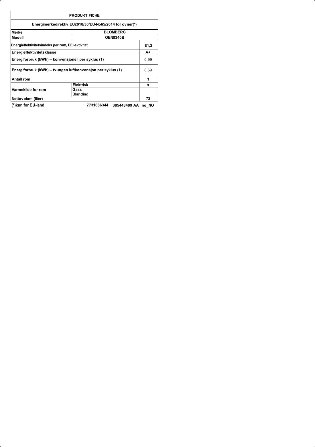 OEN8340B: Innebygd ovn (Built-in Oven 72 L)