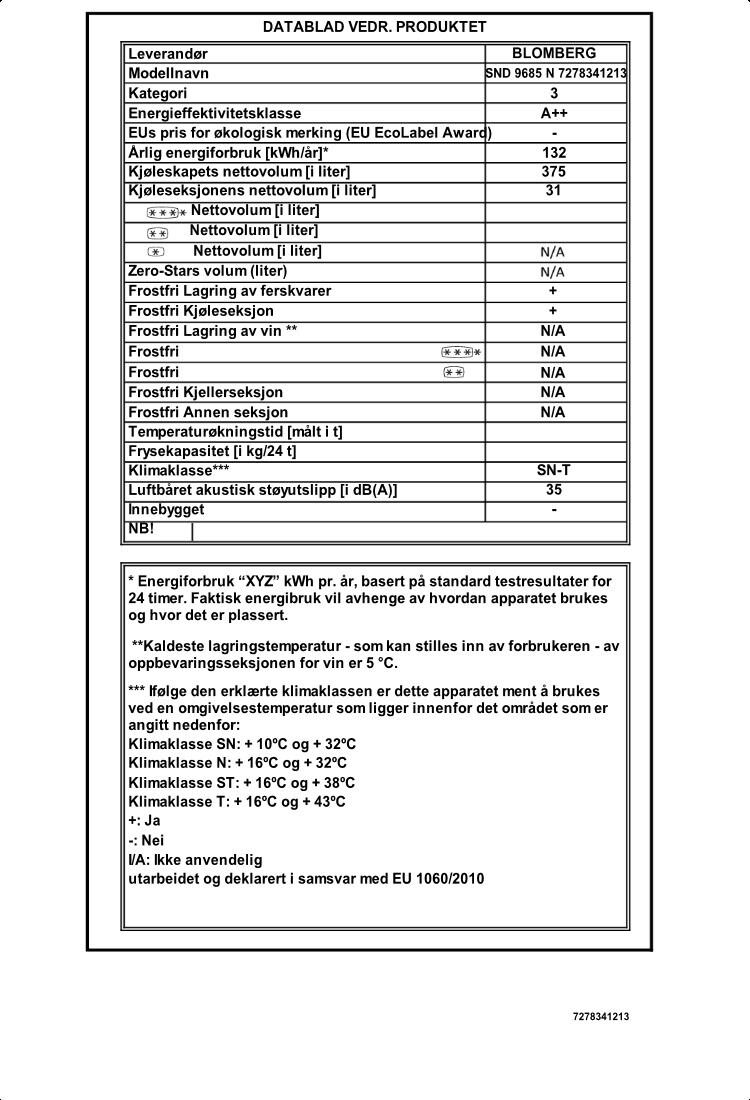 SND 9685 N: Kjøleskap (Single Door - no freezer, 375 L)