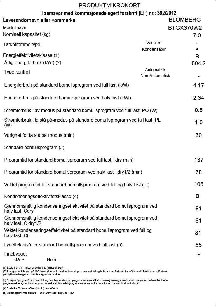 BTGX370W2: Tørketrommel (Kondensator, 7 kg)