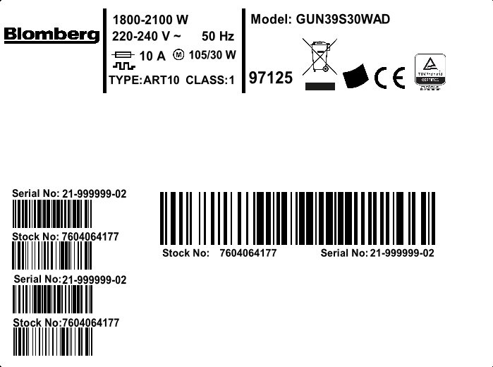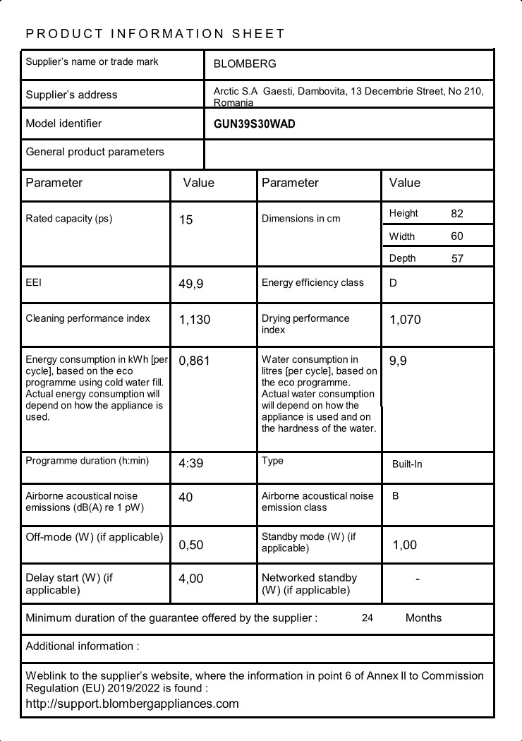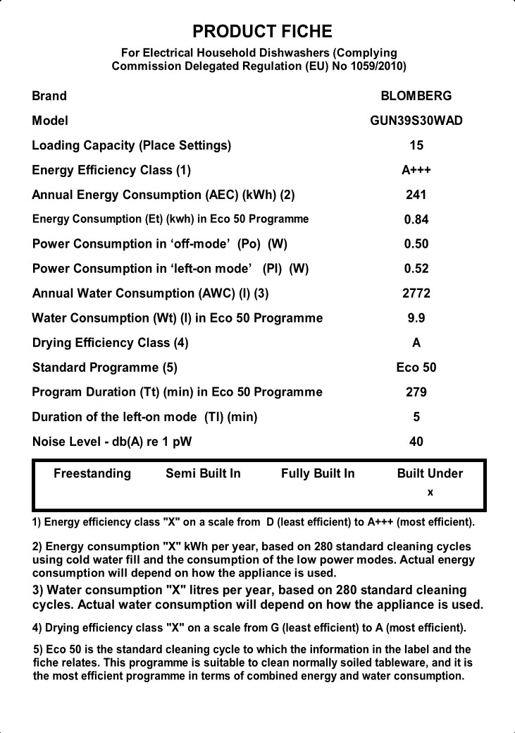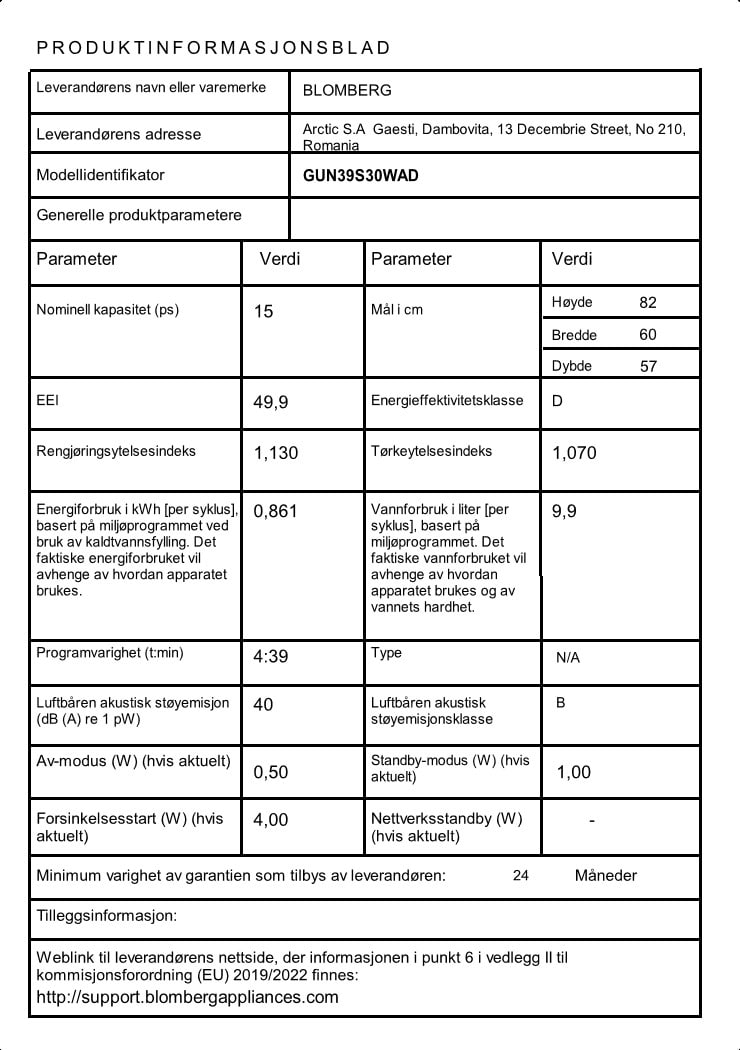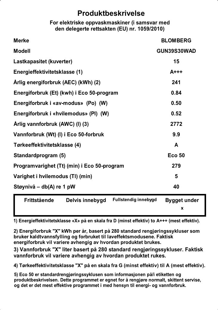 GUN39S30WAD: Frittstående opvaskmaskine (15 plassinnstillinger, Standard størrelse)