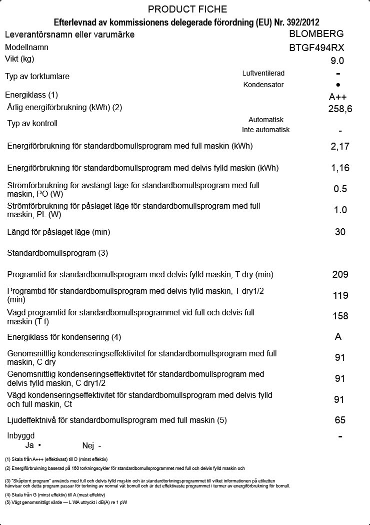 BTGF494RX: Torktumlare (Varmepumpe, 9 kg)